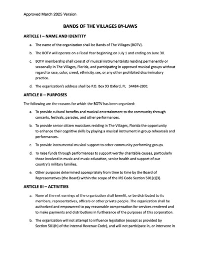 The Bands of The Villages (BOTV) is an umbrella organization which includes a variety of concert bands, musical groups, and instrumental ensembles