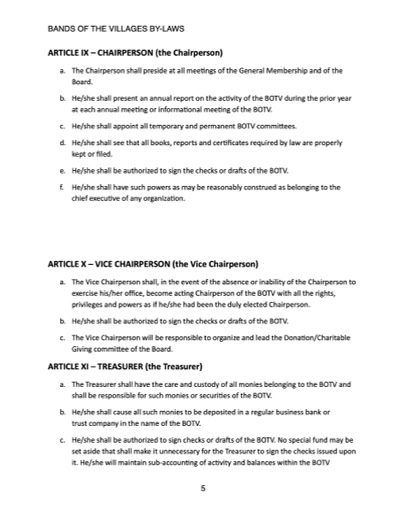 The major purpose listed in the BOTV bylaws is to provide cultural benefits and musical entertainment for the community through concerts, festivals, parades, and other events