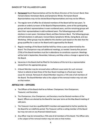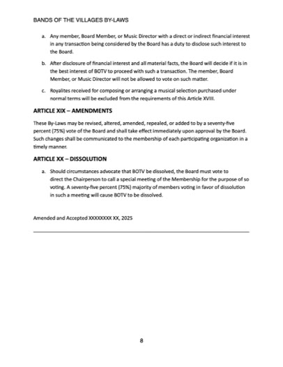 The business of the organization is managed by a Board comprising the music directors and representatives from each of the approved concert bands, groups, or ensembles