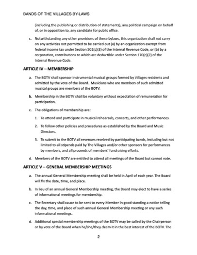The major purpose listed in the BOTV bylaws is to provide cultural benefits and musical entertainment for the community through concerts, festivals, parades, and other events